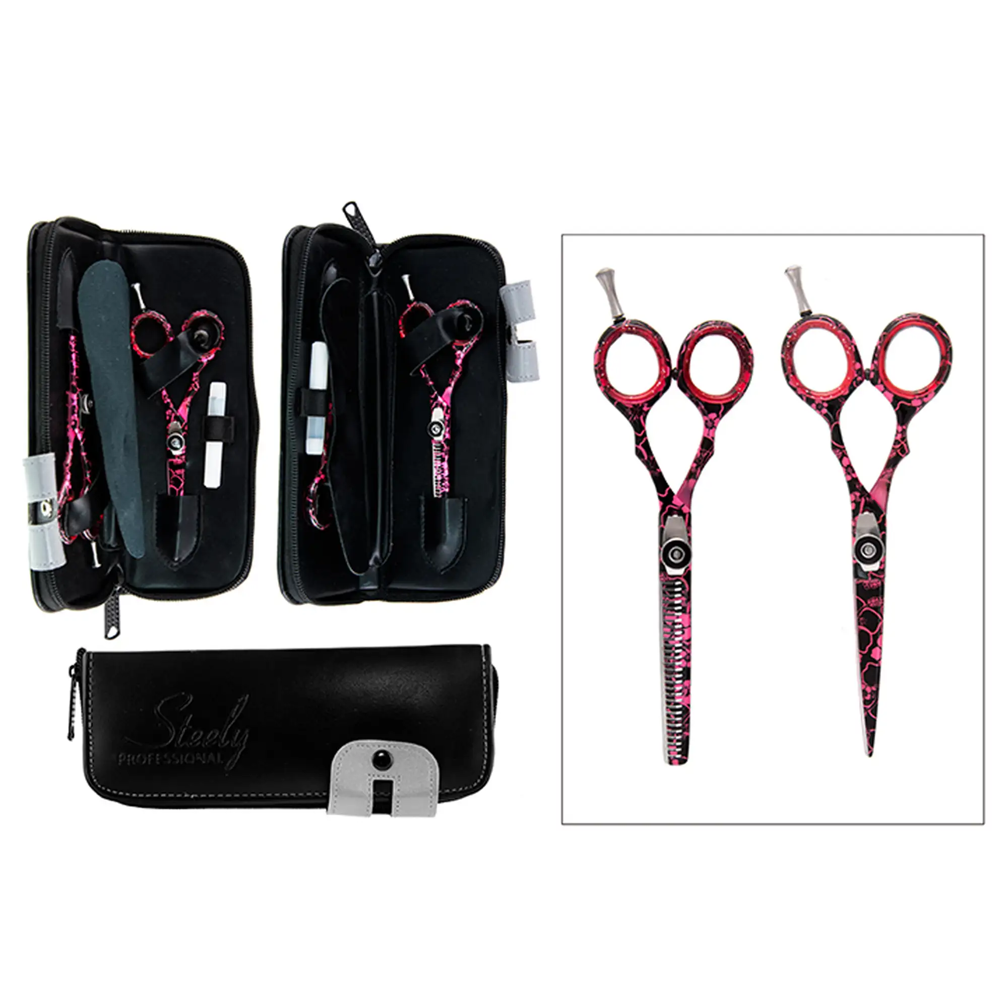 Το Steely Professional Σετ Ψαλίδια HCS-205 HTS-205 5.5″ με το μοναδικό ροζ μοτίβο και την κατασκευή από κορυφαίο ιαπωνικό ατσάλι, σας προσφέρει τη δύναμη να δημιουργείτε κορυφαία looks με απαράμιλλη άνεση και στυλ που μαγνητίζει τα βλέμματα.