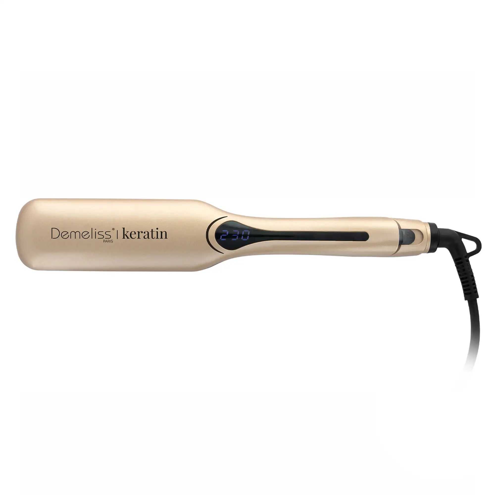 Ψηφιακή Πρέσα Μαλλιών KERA GOLD XL 45mm από τη DEMELISS με XL κεραμικές πλάκες με επίστρωση τουρμαλίνης, δυνατότητα ρύθμισης θερμοκρασίας από 100˚C έως 230˚C (σε 14 επίπεδα) και οθόνη LED με ψηφιακές ενδείξεις για ακριβή έλεγχο της θερμοκρασίας. Είναι ιδανική για την φροντίδα όλων των τύπων μαλλιών και διακρίνεται για την ελαφριά, εργονομική κατασκευή που προσφέρει εύκολο και ξεκούραστο styling. Διαθέτει σύστημα ανάρτησης, με αποτέλεσμα οι θερμαινόμενες επιφάνειες να εφαρμόζουν άψογα σε οποιοδήποτε τύπο και όγκο μαλλιού και περιστρεφόμενο καλώδιο 360° με κρίκο για κρέμασμα για ακόμα μεγαλύτερη ευελιξία κατά τη χρήση.