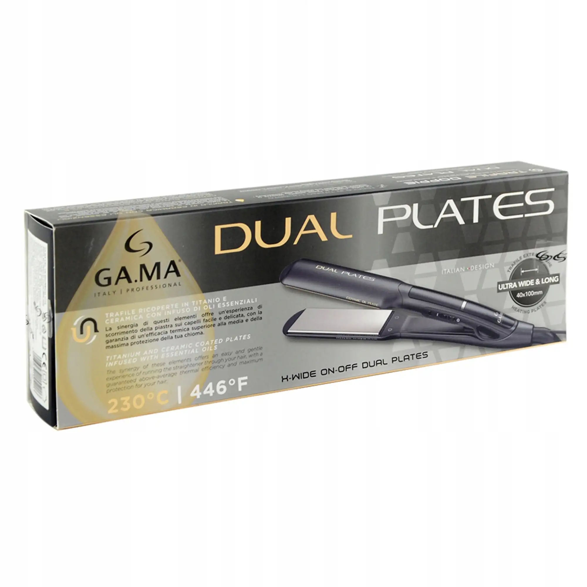 H Gama Πρέσα Μαλλιών Dual Plate X-Wide Titanium + Ceramic 230o GI3034 είναι μία πρέσα μαλλιών από τη GAMA με ισχύ 45W και μέγιστη θερμοκρασία 230°. Διαθέτει διπλές πλάκες (10×4 cm), μία με επίστρωση στιλβωμένου τιτανίου για ομοιόμορφη μετάδοση της θερμότητας και μία κεραμική, εμπλουτισμένη με αιθέρια έλαια, που χαρίζει λεία αίσθηση και προστασία στα μαλλιά.